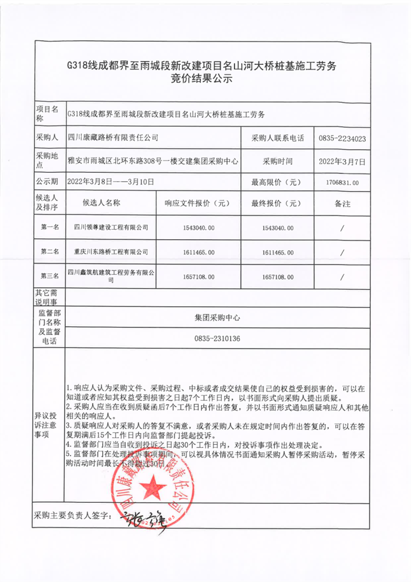 四川康藏路橋有限責(zé)任公司G318線成都界至雨城段新改建項(xiàng)目隴西河大橋樁基施工勞務(wù)競價(jià)結(jié)果公示