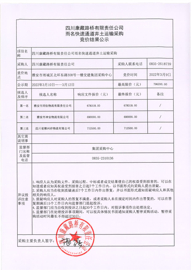 四川康藏路橋有限責任公司雨名快速通道棄土運輸采購競價結(jié)果公示