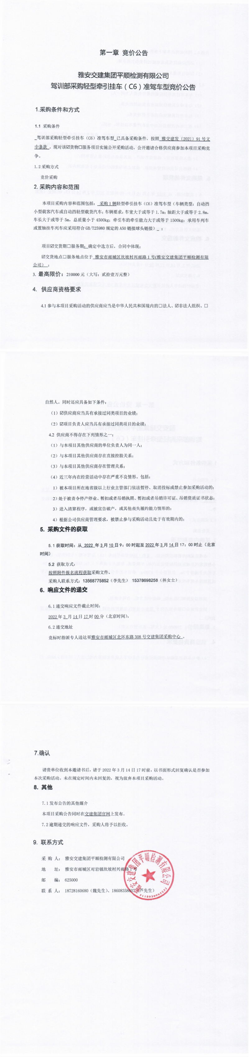 雅安交建集團(tuán)平順檢測(cè)有限公司駕訓(xùn)部采購(gòu)輕型牽引掛車(chē)(C6)準(zhǔn)駕車(chē)型競(jìng)價(jià)公告