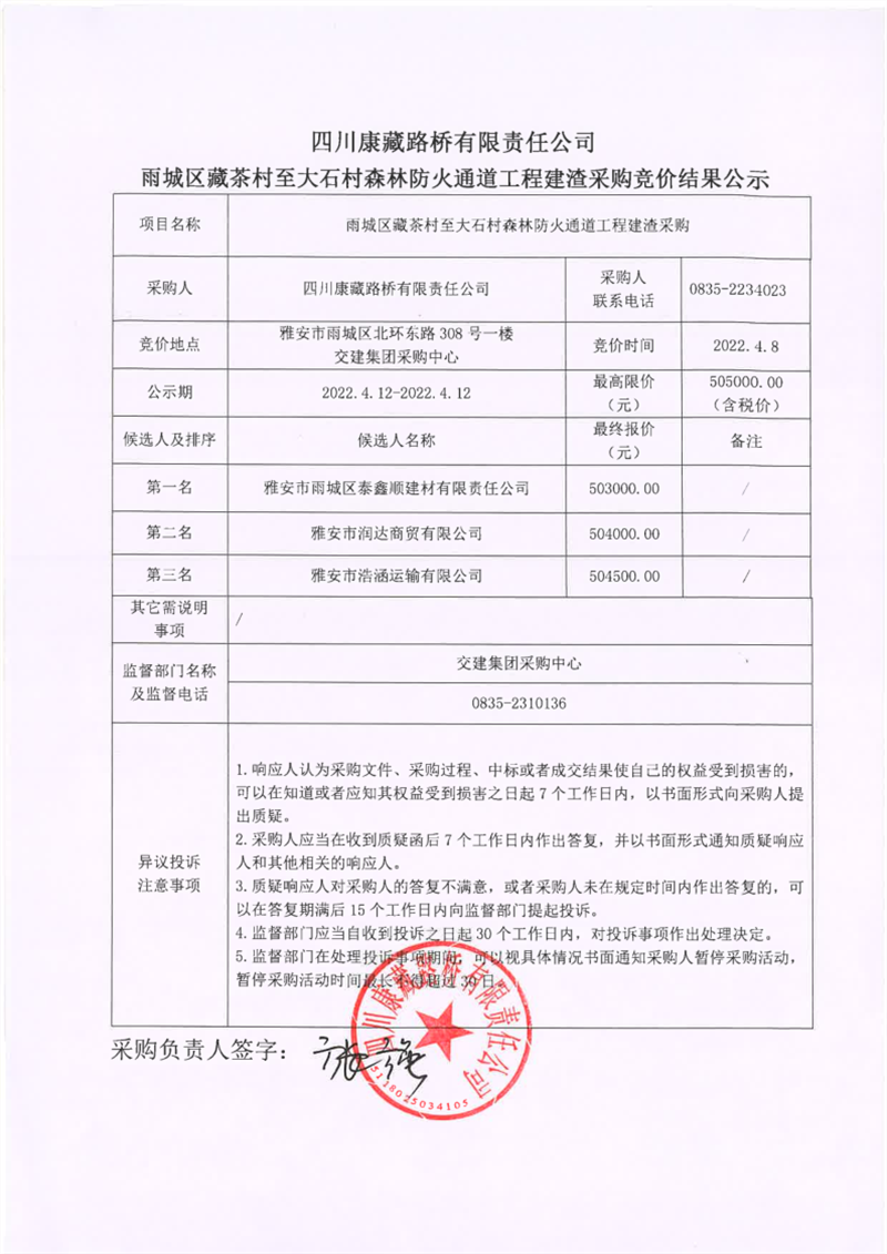 四川康藏路橋有限責(zé)任公司雨城區(qū)藏茶村至大石村森林防火通道工程建渣采購競價(jià)結(jié)果公示
