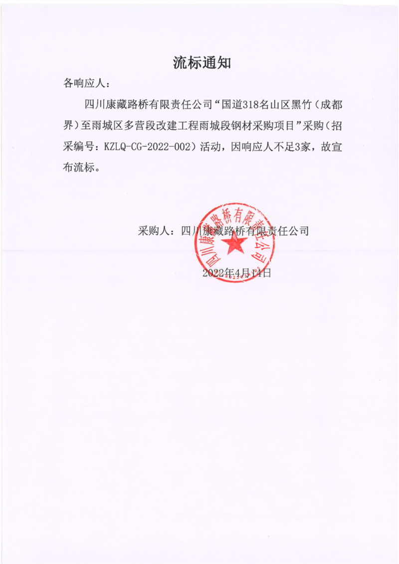 四川康藏路橋有限責(zé)任公司國道318名山區(qū)黑竹(成都界)至雨城區(qū)多營段改建工程雨城段鋼材采購項(xiàng)目流標(biāo)通知
