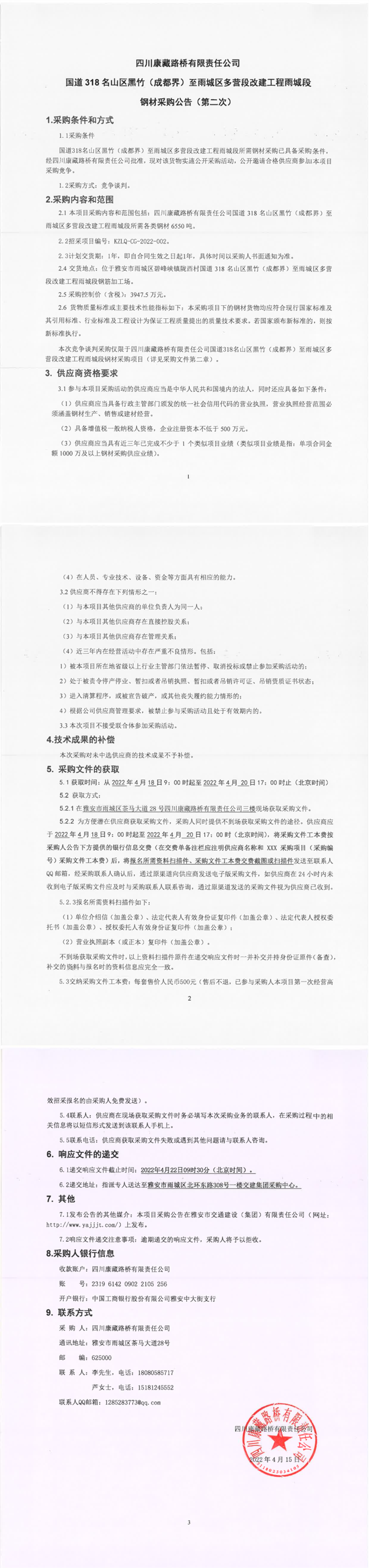 四川康藏路橋有限責(zé)任公司國(guó)道318名山區(qū)黑竹(成都界)至雨城區(qū)多營(yíng)段改建工程雨城段鋼材采購(gòu)公告(第二次)