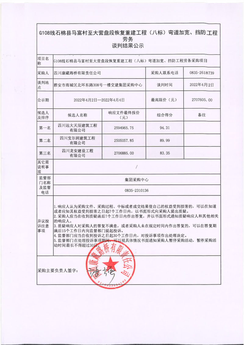 四川康藏路橋有限責任公司G108線石棉縣馬富村至大營盤段恢復(fù)重建工程(八標)彎道加寬、擋防工程勞務(wù)談判結(jié)果公示