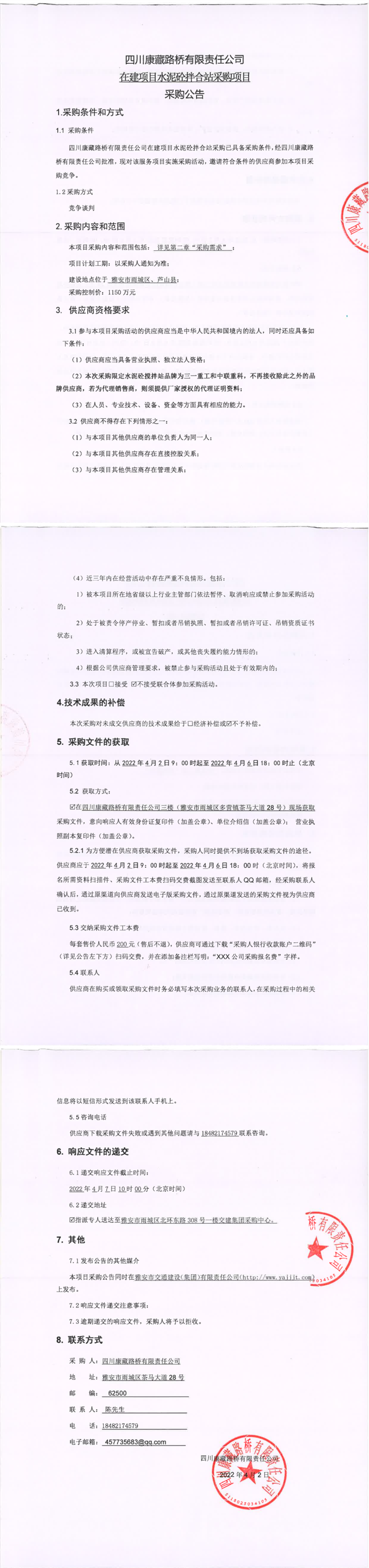 四川康藏路橋有限責任公司在建項目水泥砼拌合站采購項目采購公告