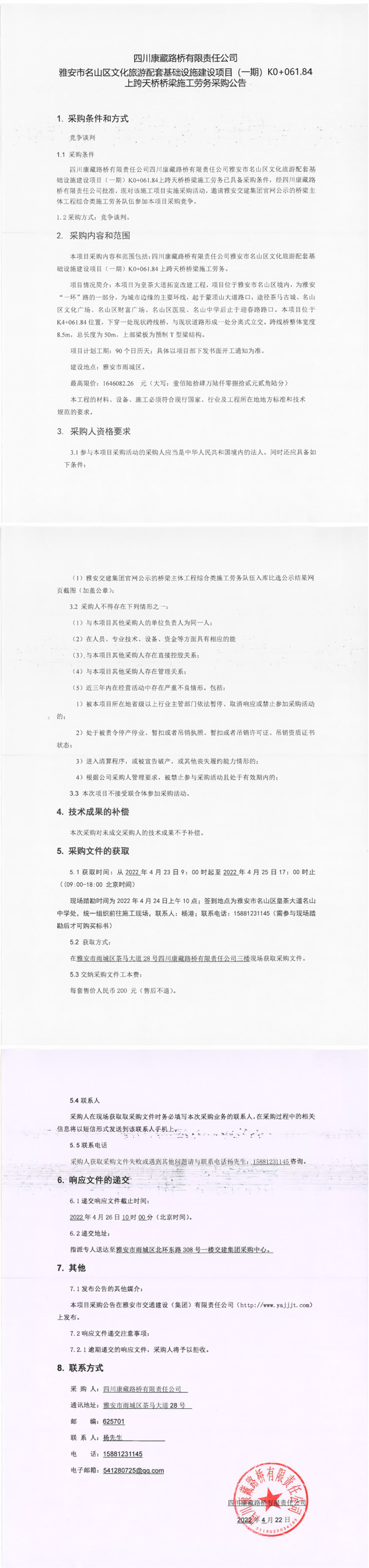 四川康藏路橋有限責任公司雅安市名山區(qū)文化旅游配套基礎設施建設項目(一期)K0+061.84上跨天橋橋梁施工勞務采購公告