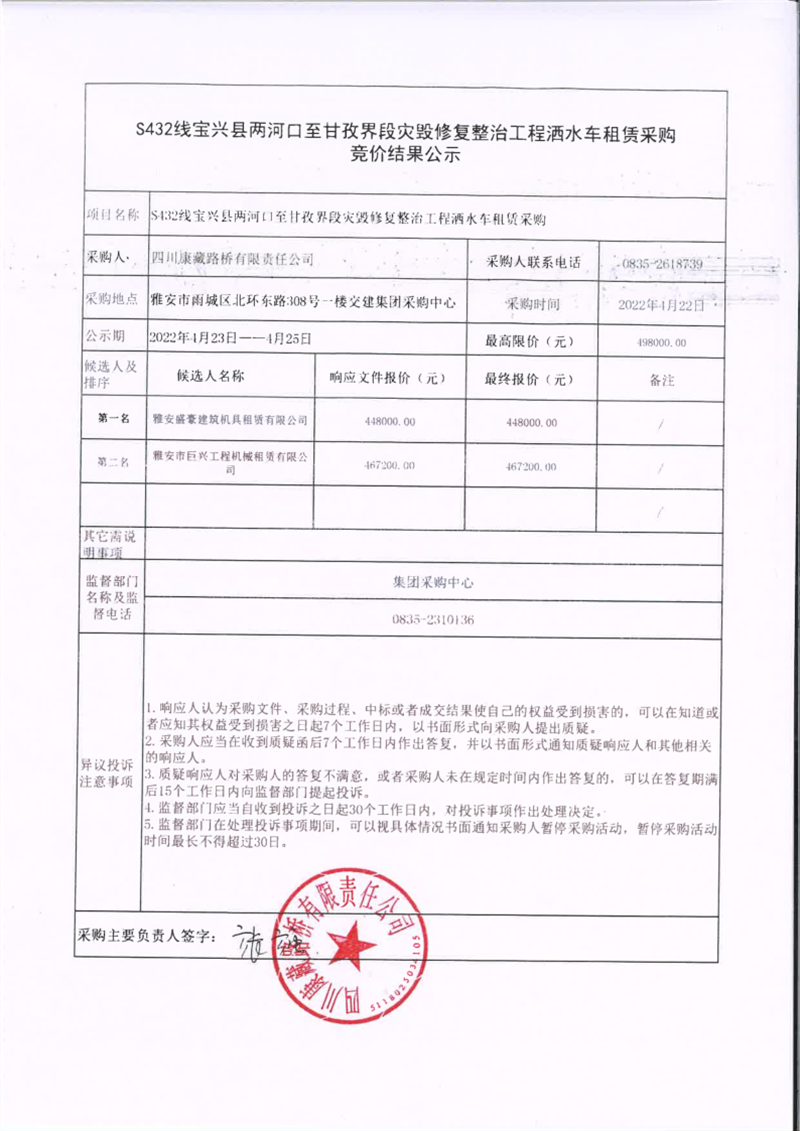 四川康藏路橋有限責(zé)任公司S432線寶興縣兩河口至甘孜界段災(zāi)毀修復(fù)整治工程灑水車租賃采購競價結(jié)果公示