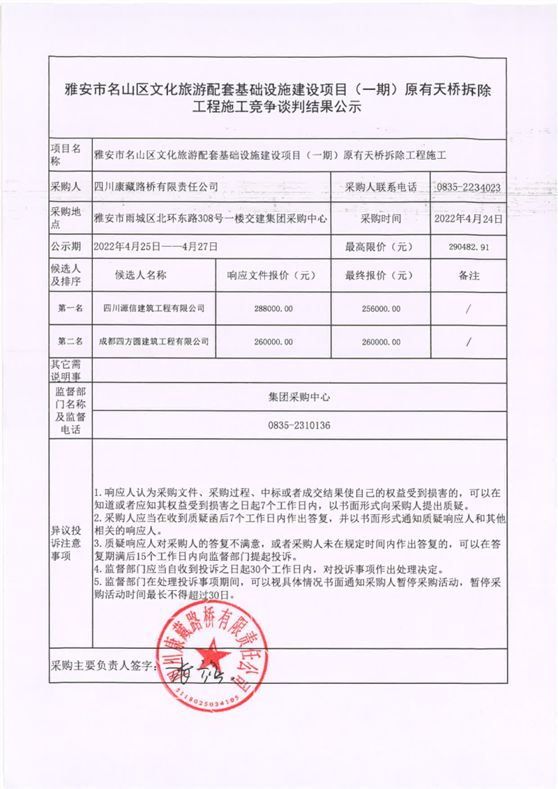 四川康藏路橋有限責任公司雅安市名山區(qū)文化旅游配套基礎設施建設項目(一期)原有天橋拆除工程施工競爭談判結果公示