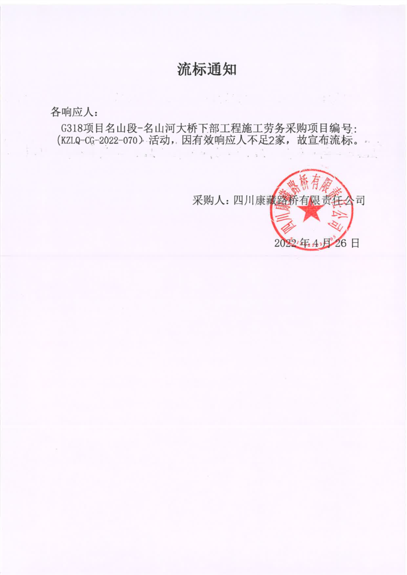 四川康藏路橋有限責任公司G318項目名山段-名山河大橋下部工程施工勞務(wù)采購項目流標通知