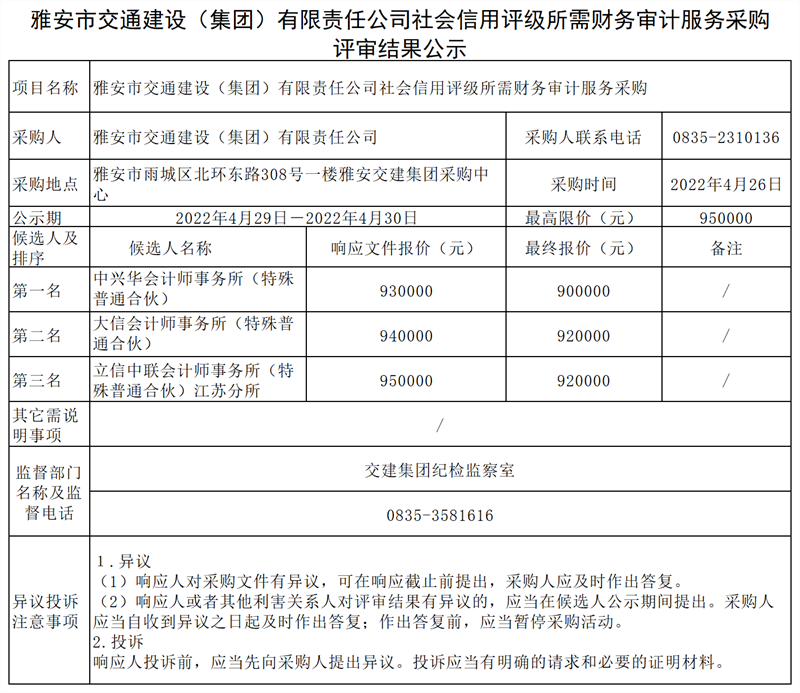 雅安市交通建設(shè)(集團)有限責(zé)任公司社會信用評級所需財務(wù)審計服務(wù)采購評審結(jié)果公示