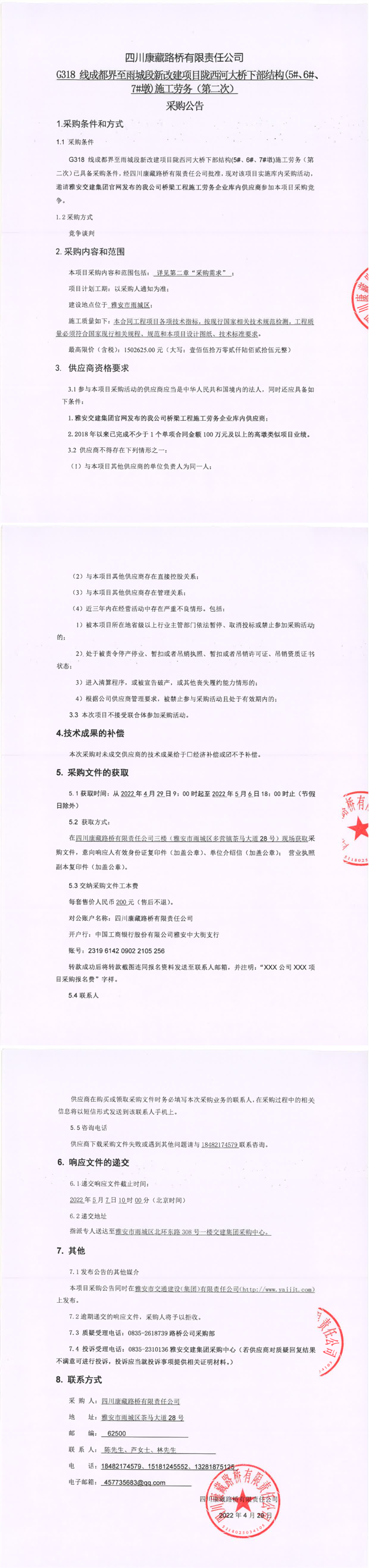 四川康藏路橋有限責任公司G318線成都界至雨城段新改建項目隴西河大橋下部結構(5#、6#、7#墩)施工勞務(第二次)采購公告