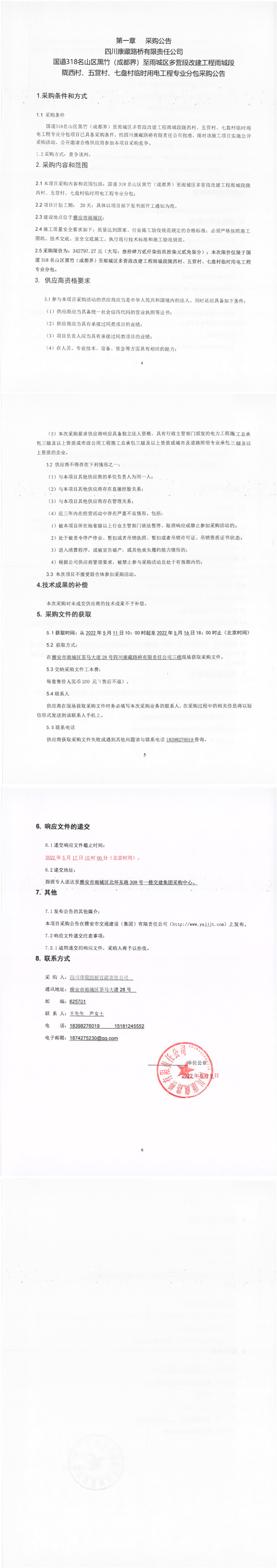 四川康藏路橋有限責(zé)任公司國(guó)道318名山區(qū)黑竹(成都界)至雨城區(qū)多營(yíng)段改建工程雨城段隴西材、五營(yíng)村、七盤村臨時(shí)用電工程專業(yè)分包采購(gòu)公告