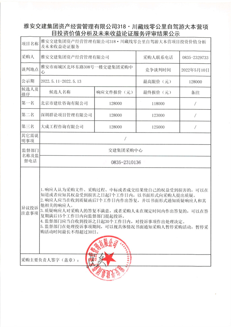 雅安交建集團(tuán)資產(chǎn)經(jīng)營(yíng)管理有限公司318·川藏線零公里自駕游大本營(yíng)項(xiàng)目投資價(jià)值分析及未來收益論證服務(wù)評(píng)審結(jié)果公示