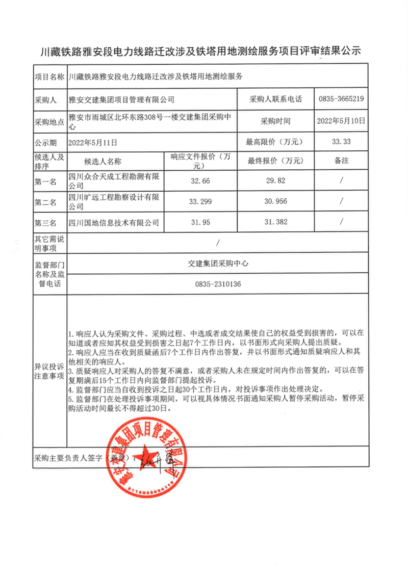 雅安交建集團(tuán)項(xiàng)目管理有限公司川藏鐵路雅安段電力線路遷改涉及鐵塔用地測(cè)繪服務(wù)項(xiàng)目評(píng)審結(jié)果公示