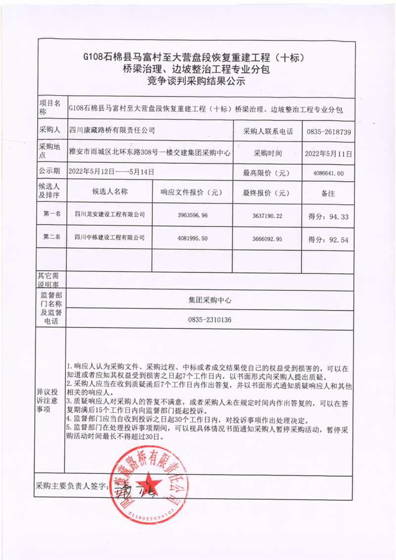 四川康藏路橋有限責任公司G108線石棉縣馬富村至大營盤段恢復(fù)重建工程(十標)橋梁治理、邊坡整治工程專業(yè)分包競爭談判采購結(jié)果公示