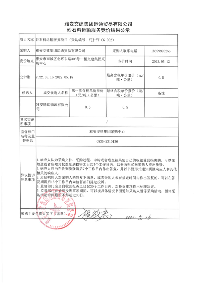 雅安交建集團(tuán)運(yùn)通貿(mào)易有限公司砂石料運(yùn)輸服務(wù)競(jìng)價(jià)結(jié)果公示