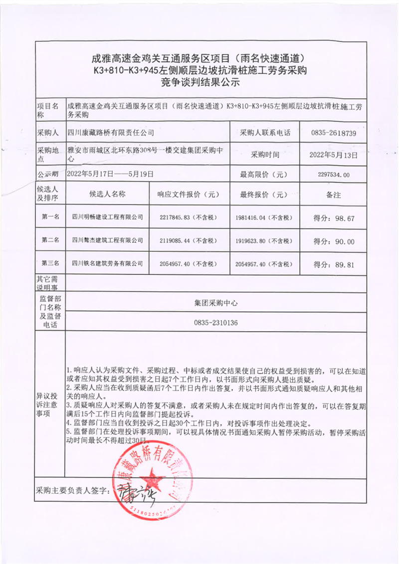 四川康藏路橋有限責(zé)任公司成雅高速金雞關(guān)互通服務(wù)區(qū)項(xiàng)目(雨名快速通道)K3+810-K3+945左側(cè)順層邊坡抗滑樁施工勞務(wù)采購(gòu)競(jìng)爭(zhēng)談判結(jié)果公示