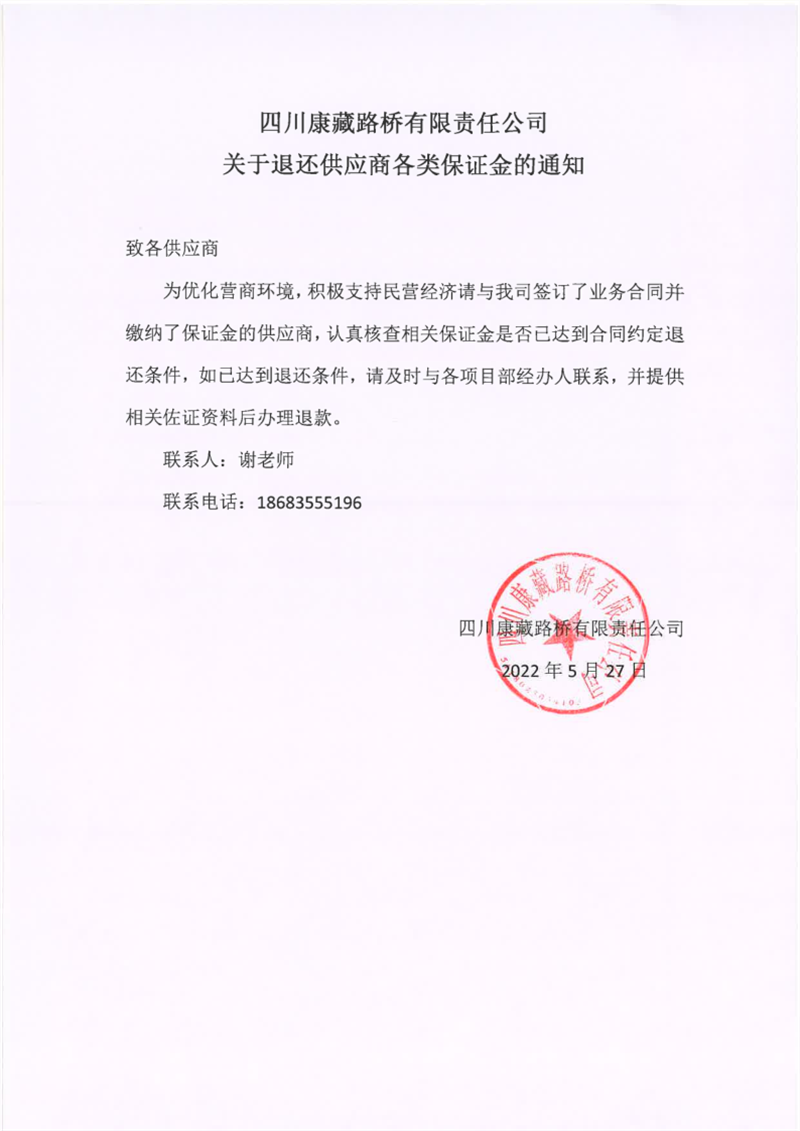四川康藏路橋有限責(zé)任公司關(guān)于退還供應(yīng)商各類保證金的通知