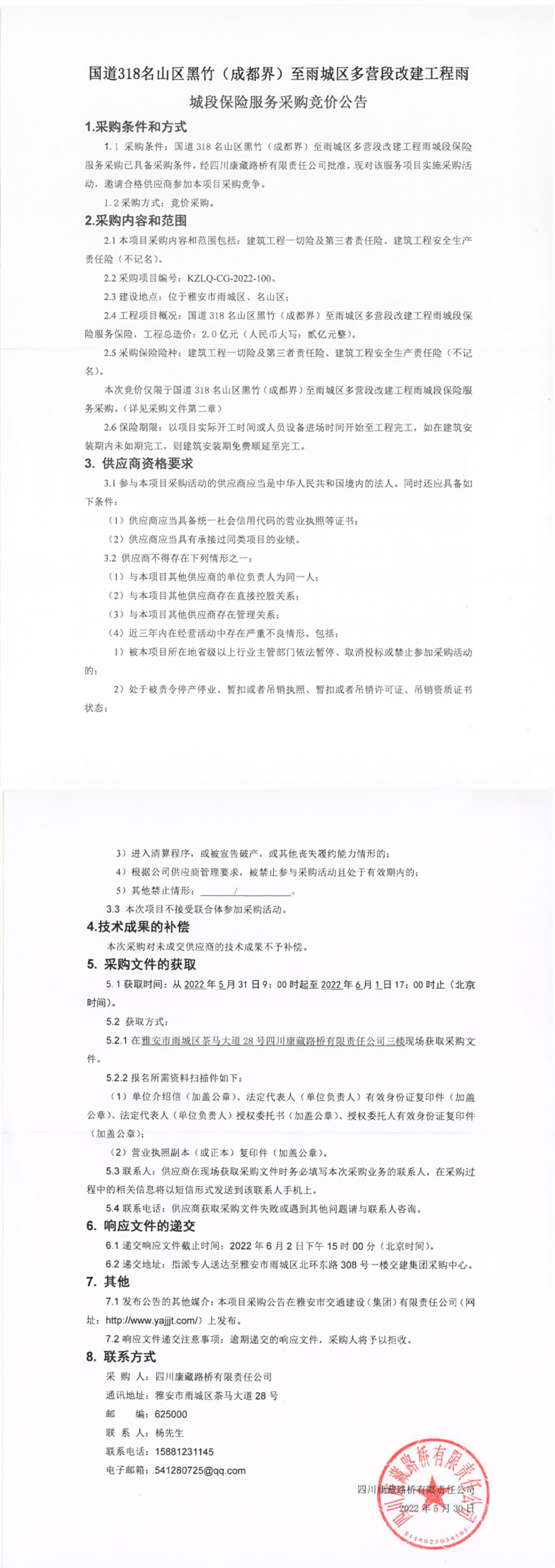 四川康藏路橋有限責(zé)任公司國道318名山區(qū)黑竹(成都界)至雨城區(qū)多營段改建工程雨城段保險(xiǎn)服務(wù)采購競價(jià)公告