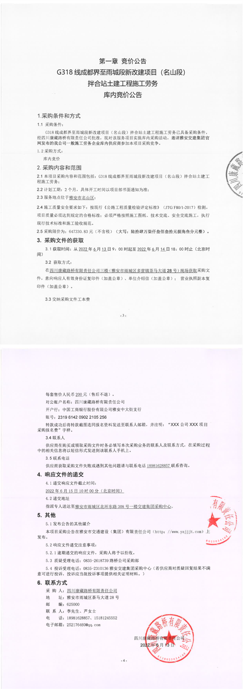 四川康藏路橋有限責(zé)任公司G318線成都界至雨城段新改建項(xiàng)目(名山段)拌合站土建工程施工勞務(wù)庫(kù)內(nèi)競(jìng)價(jià)公告