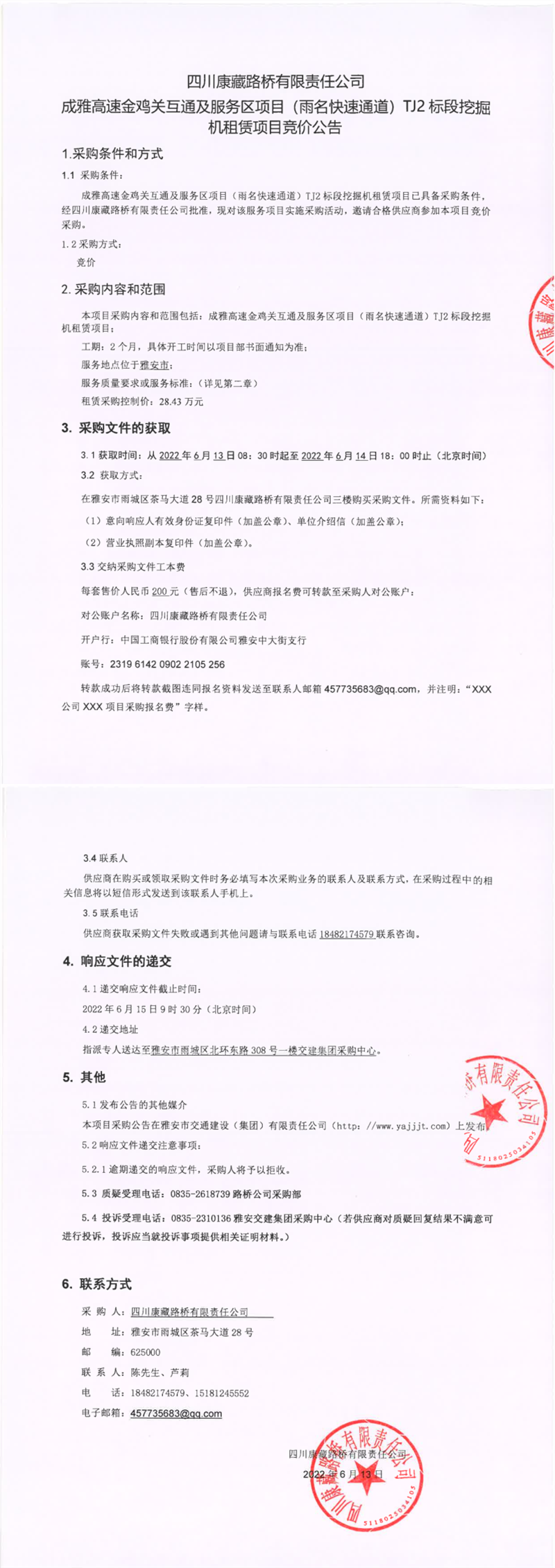 四川康藏路橋有限責(zé)任公司成雅高速金雞關(guān)互通及服務(wù)區(qū)項目(雨名快速通道)TJ2標(biāo)段挖掘機(jī)租賃項目競價公告