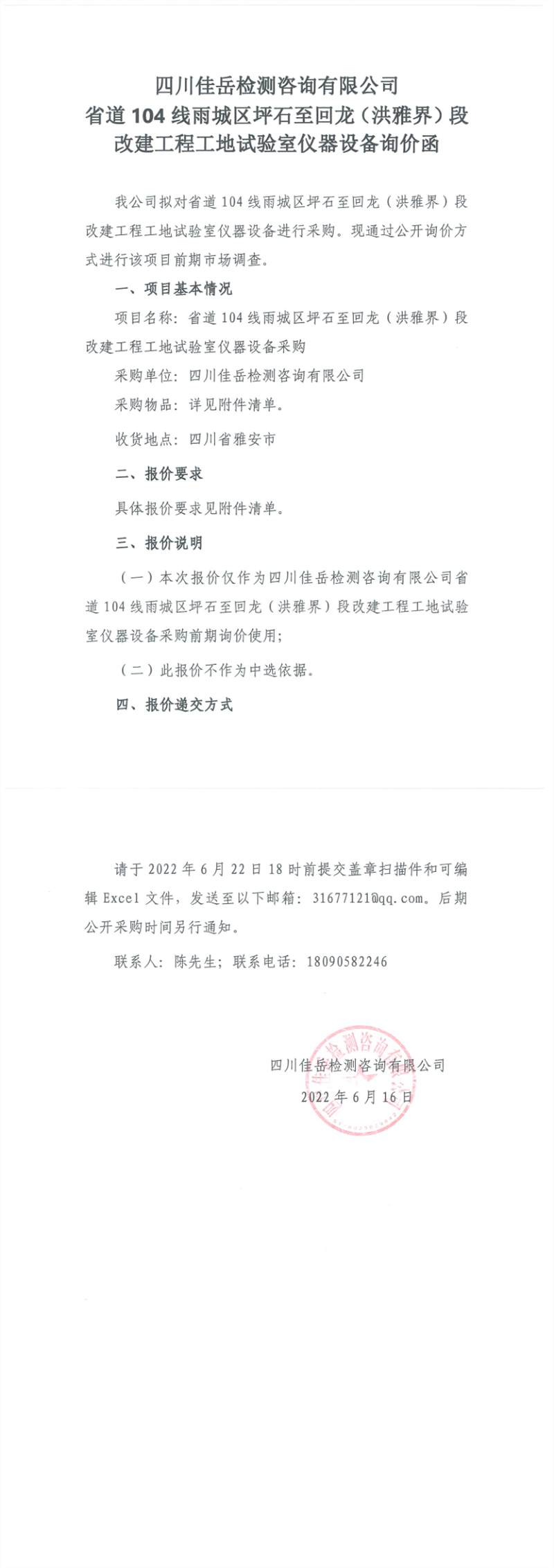 四川佳岳檢測(cè)咨詢有限公司省道104線雨城區(qū)坪石至回龍(洪雅界)段改建工程工地試驗(yàn)室儀器設(shè)備詢價(jià)函