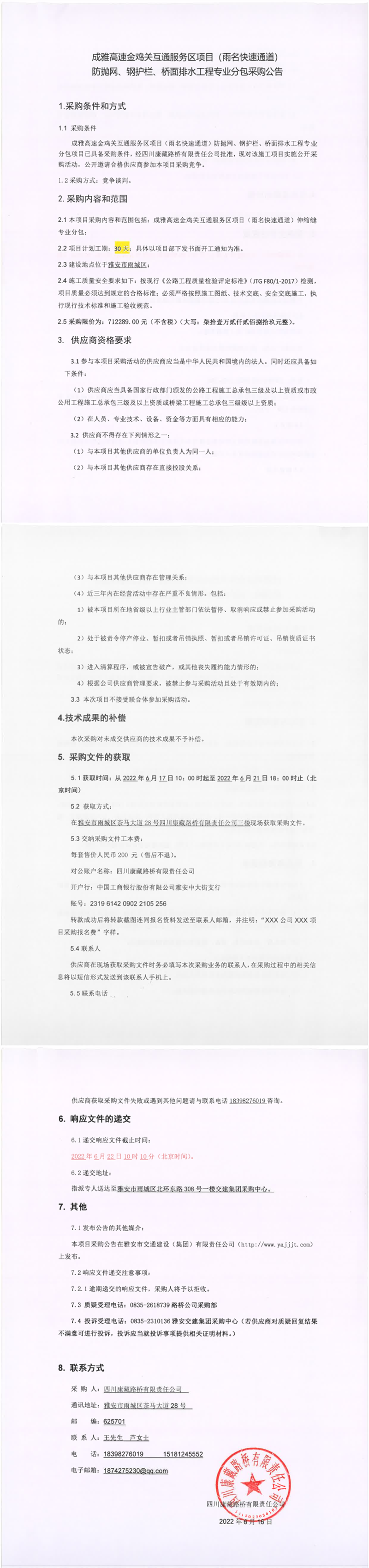 四川康藏路橋有限責任公司成雅高速金雞關互通服務區(qū)項目(雨名快速通道)防拋網、鋼護欄、橋面排水工程專業(yè)分包采購公告