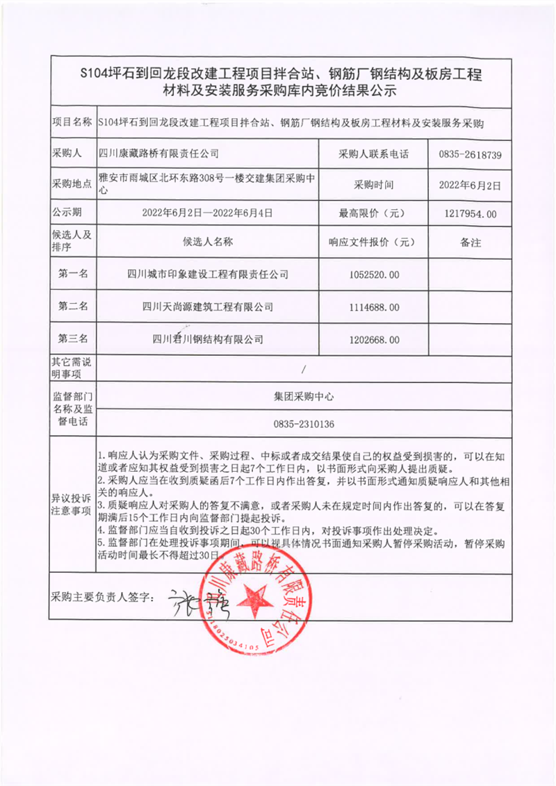四川康藏路橋有限責任公司S104坪石到回龍段改建工程項目拌合站、鋼筋廠鋼結構及板房工程材料及安裝服務庫內(nèi)競價結果公示