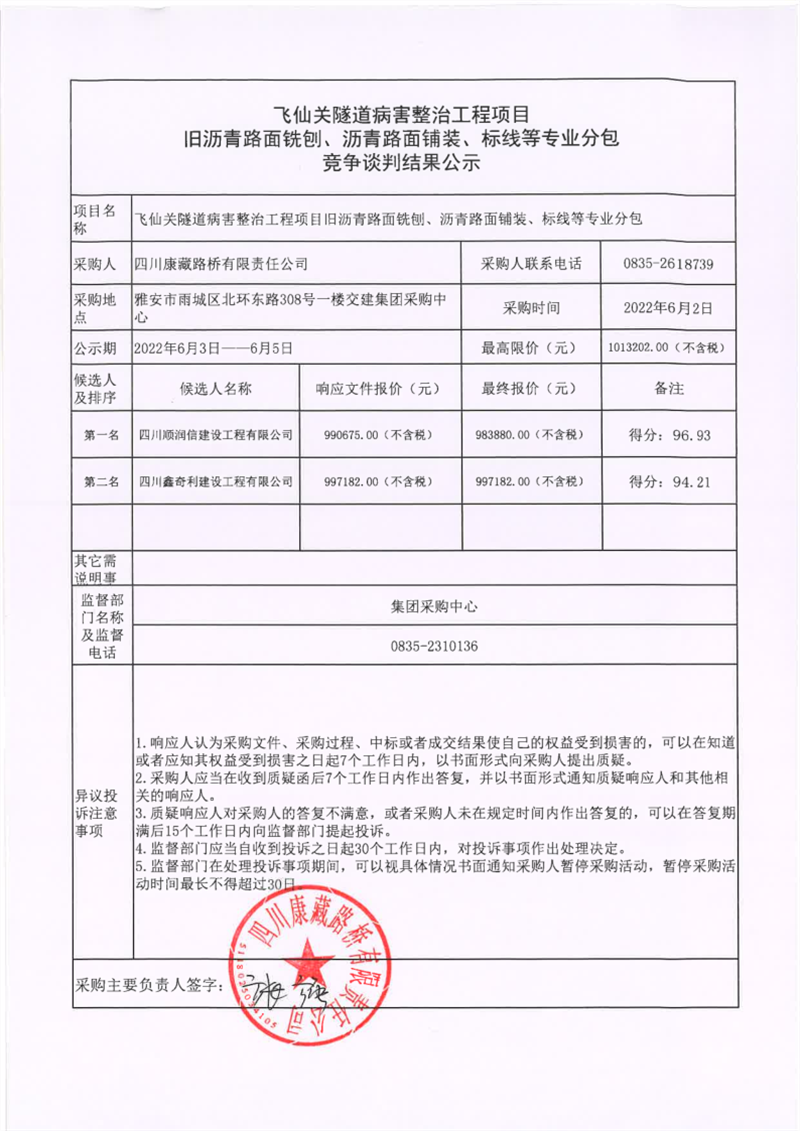 四川康藏路橋有限責(zé)任公司飛仙關(guān)隧道病害整治工程項目舊瀝青路面銑刨、瀝青路面鋪裝、標(biāo)線等專業(yè)分包競爭談判結(jié)果公示