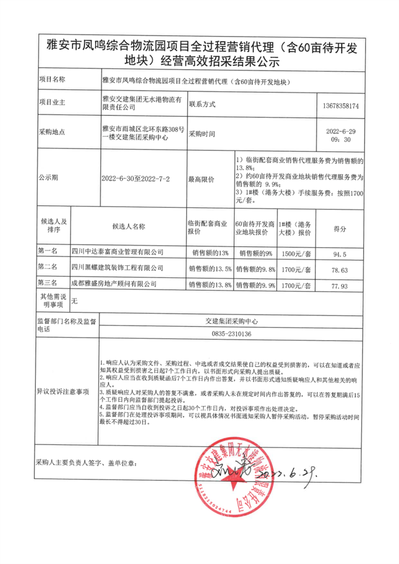 雅安交建集團無水港物流有限責任公司雅安市鳳鳴綜合物流園項目全過程營銷代理(含60畝待開發(fā)地塊)經營高效招采結果公示
