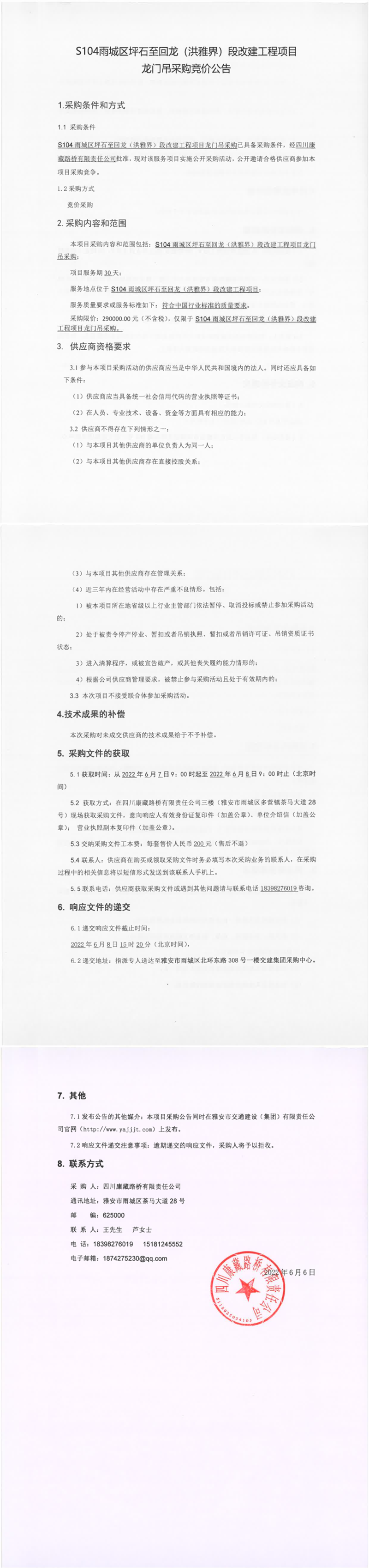四川康藏路橋有限責(zé)任公司S104雨城區(qū)坪石至回龍(洪雅界)段改建工程項(xiàng)目龍門(mén)吊采購(gòu)競(jìng)價(jià)公告