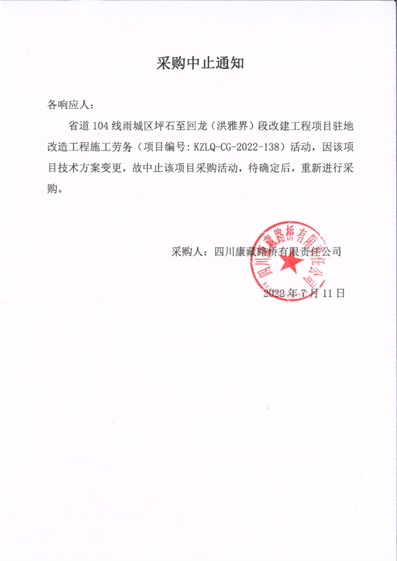 四川康藏路橋有限責任公司省道104線雨城區(qū)坪石至回龍(洪雅界)段改建工程項目駐地改造工程施工勞務(wù)采購中止通知