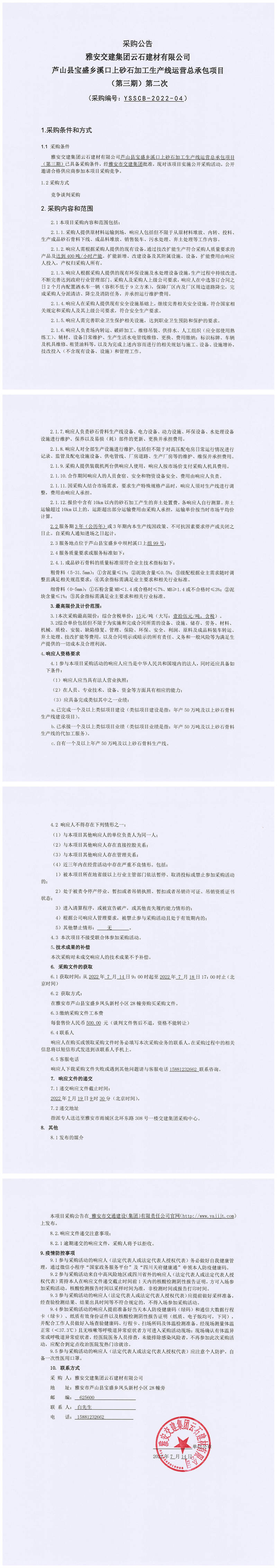 雅安交建集團(tuán)云石建材有限公司蘆山縣寶盛鄉(xiāng)溪口上砂石加工生產(chǎn)線運營總承包項目(第三期)第二次采購公告