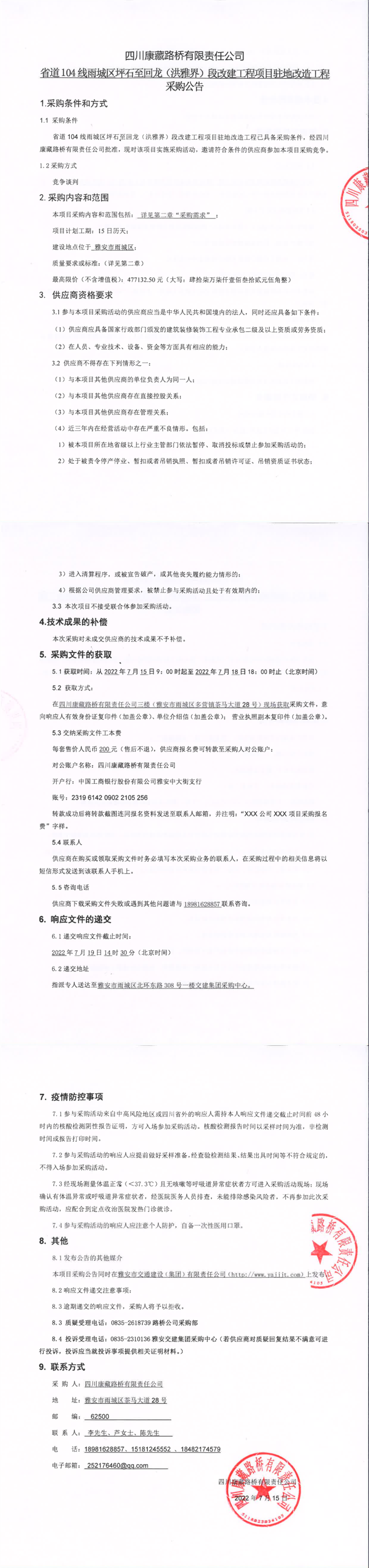 四川康藏路橋有限責(zé)任公司省道104線雨城區(qū)坪石至回龍(洪雅界)段改建工程項目駐地改造工程采購公告