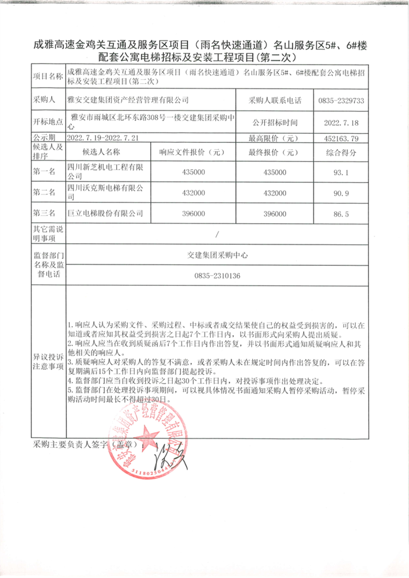 雅安交建集團資產(chǎn)經(jīng)營管理有限公司成雅高速金雞關(guān)互通及服務區(qū)項目(雨名快速通道)名山服務區(qū)5#、6#樓配套公寓電梯招標及安裝工程項目招標公告(第二次)結(jié)果公示