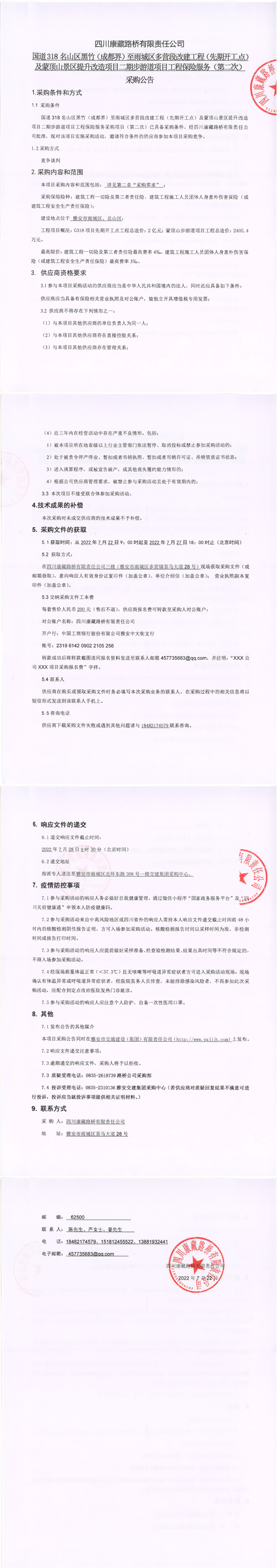 四川康藏路橋有限責(zé)任公司國道318名山區(qū)黑竹(成都界)至雨城區(qū)多營段改建工程(先期開工點(diǎn))及蒙頂山景區(qū)提升改造項(xiàng)目二期步游道項(xiàng)目工程保險(xiǎn)服務(wù)(第二次)采購公告