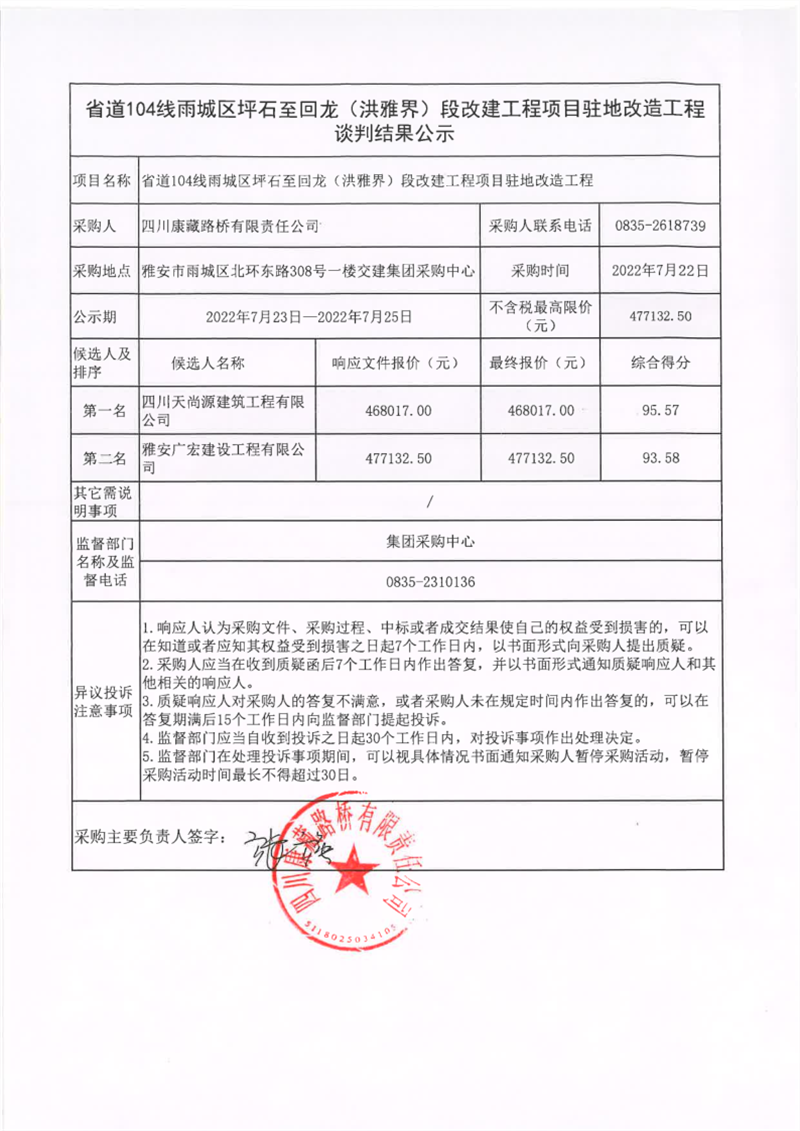 四川康藏路橋有限責(zé)任公司省道104線雨城區(qū)坪石至回龍(洪雅界)段改建工程項目駐地改造工程談判結(jié)果公示