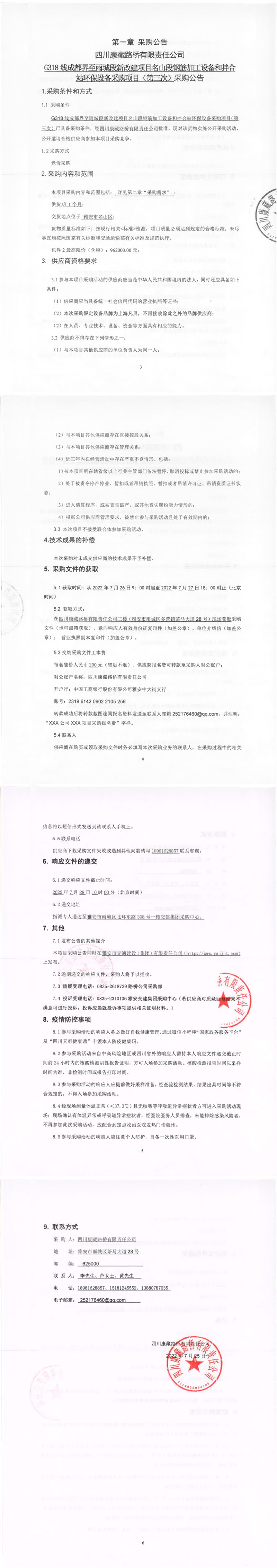 四川康藏路橋有限責(zé)任公司G318線成都界至雨城段新改建項目名山段鋼筋加工設(shè)備和拌合站環(huán)保設(shè)備采購項目(第三次)采購公告