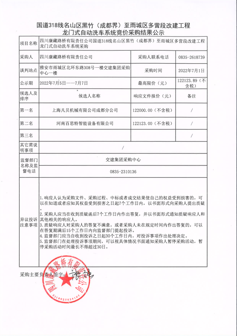四川康藏路橋有限責任公司國道318名山區(qū)黑竹(成都界)至雨城區(qū)多營段改建工程龍門式自動洗車系統競價采購結果公示