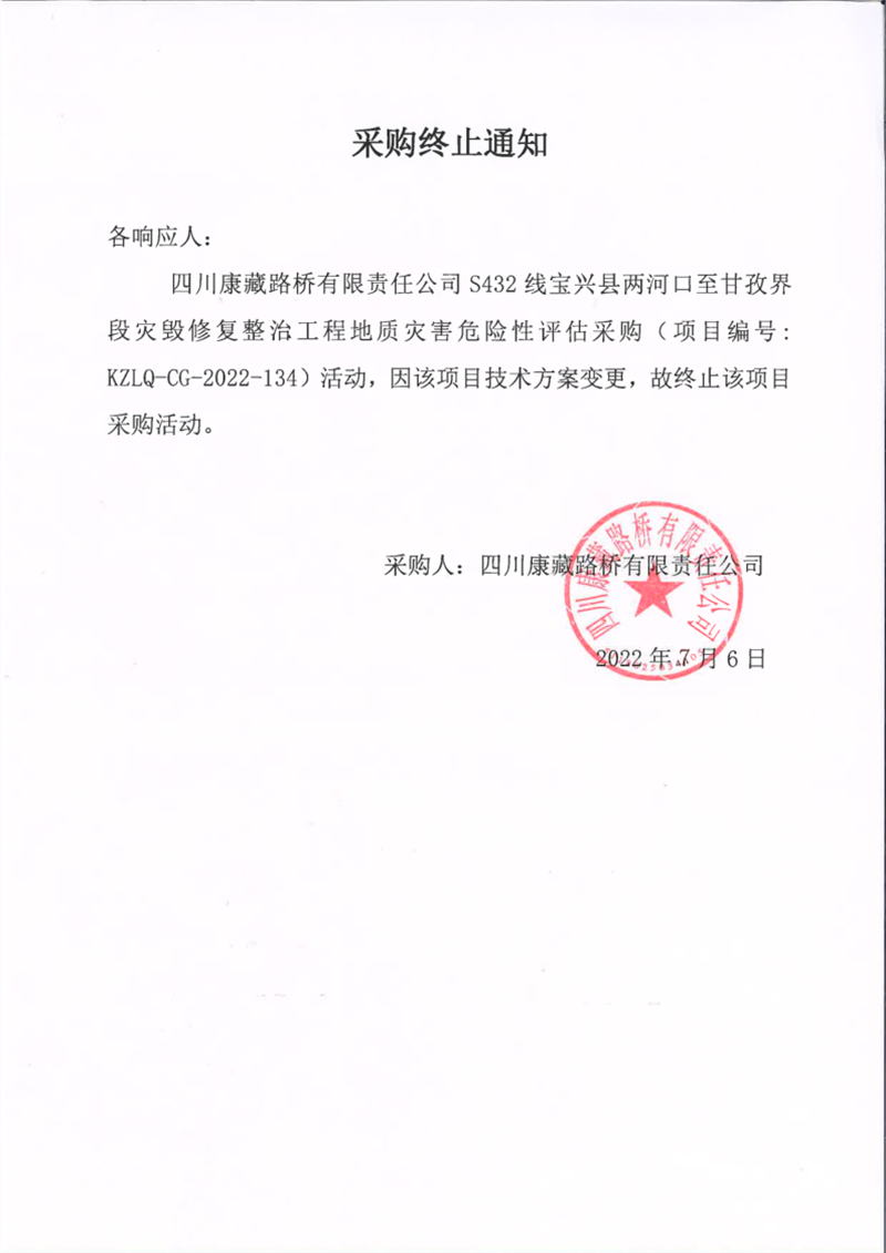 四川康藏路橋有限責(zé)任公司S432線寶興縣兩河口至甘孜界段災(zāi)毀修復(fù)整治工程地質(zhì)災(zāi)害危險(xiǎn)性評(píng)估采購終止通知