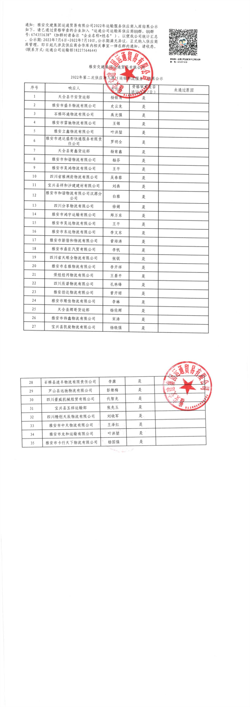 雅安交建集團運通貿(mào)易有限公司2022年第二次供應(yīng)商入庫(運輸物流服務(wù))結(jié)果公示