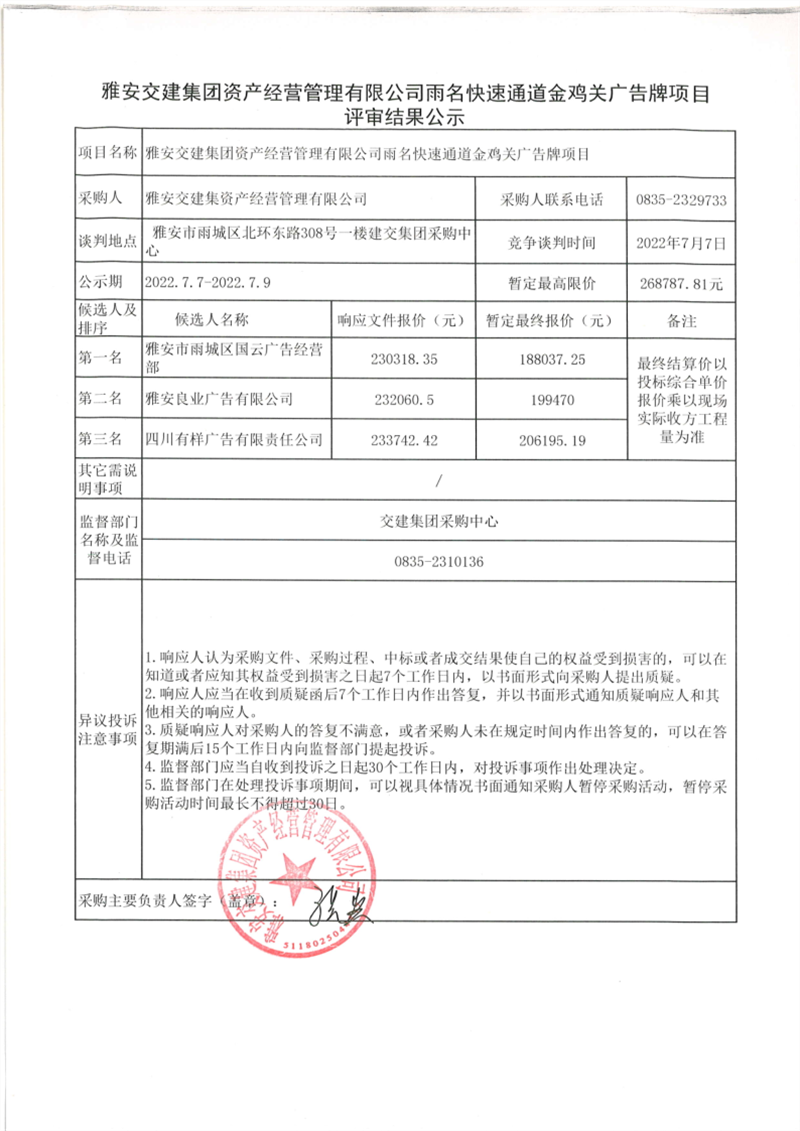 雅安交建集團資產經營管理有限公司雨名快速通道金雞關廣告牌項目評審結果公示