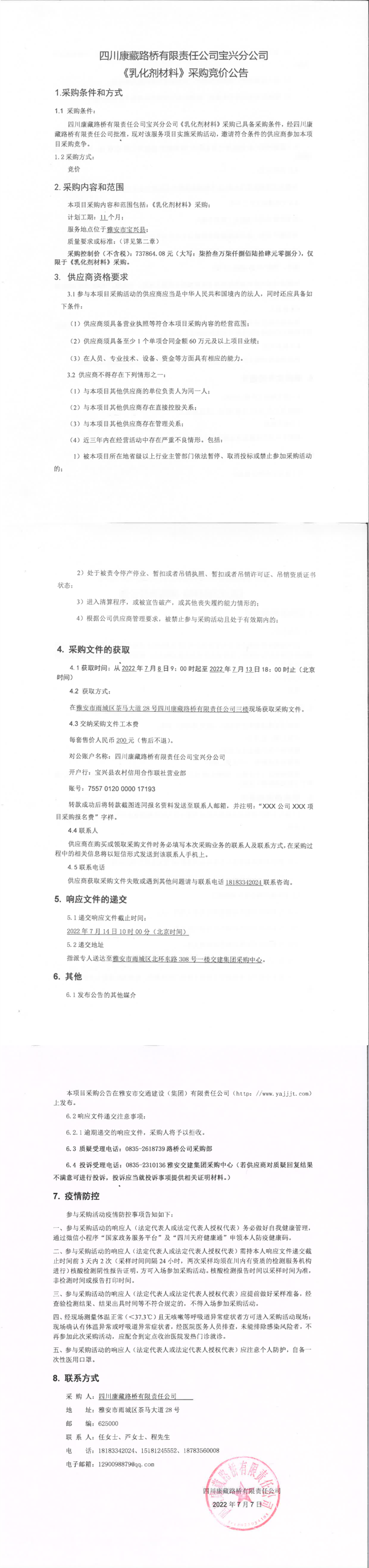 四川康藏路橋有限責任公司寶興分公司乳化劑材料采購競價公告
