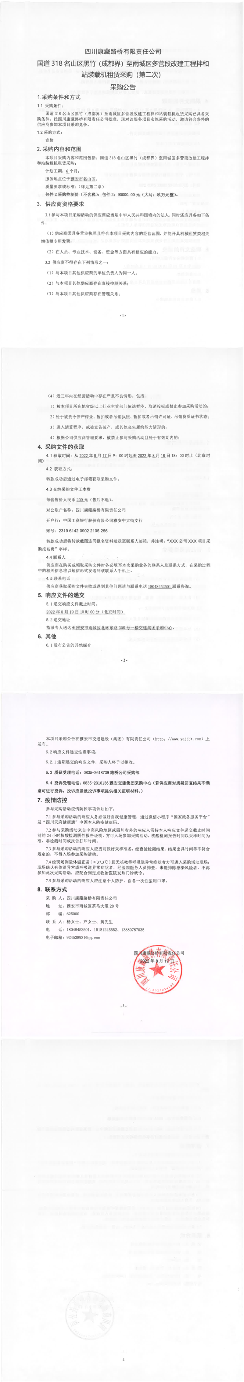 四川康藏路橋有限責(zé)任公司國道318名山區(qū)黑竹(成都界)至雨城區(qū)多營段改建工程拌和站裝載機(jī)租賃(包件1)結(jié)果公示