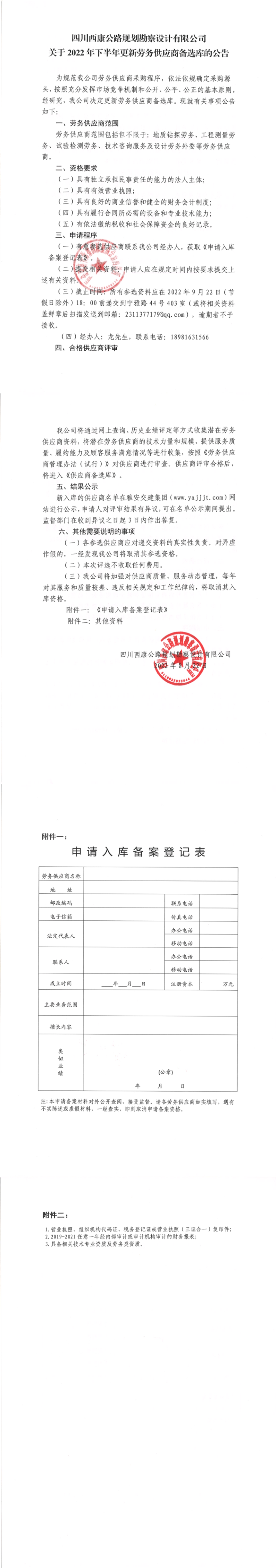 四川西康公路規(guī)劃勘察設(shè)計(jì)有限公司關(guān)于2022年下半年更新勞務(wù)供應(yīng)商備選庫的公告