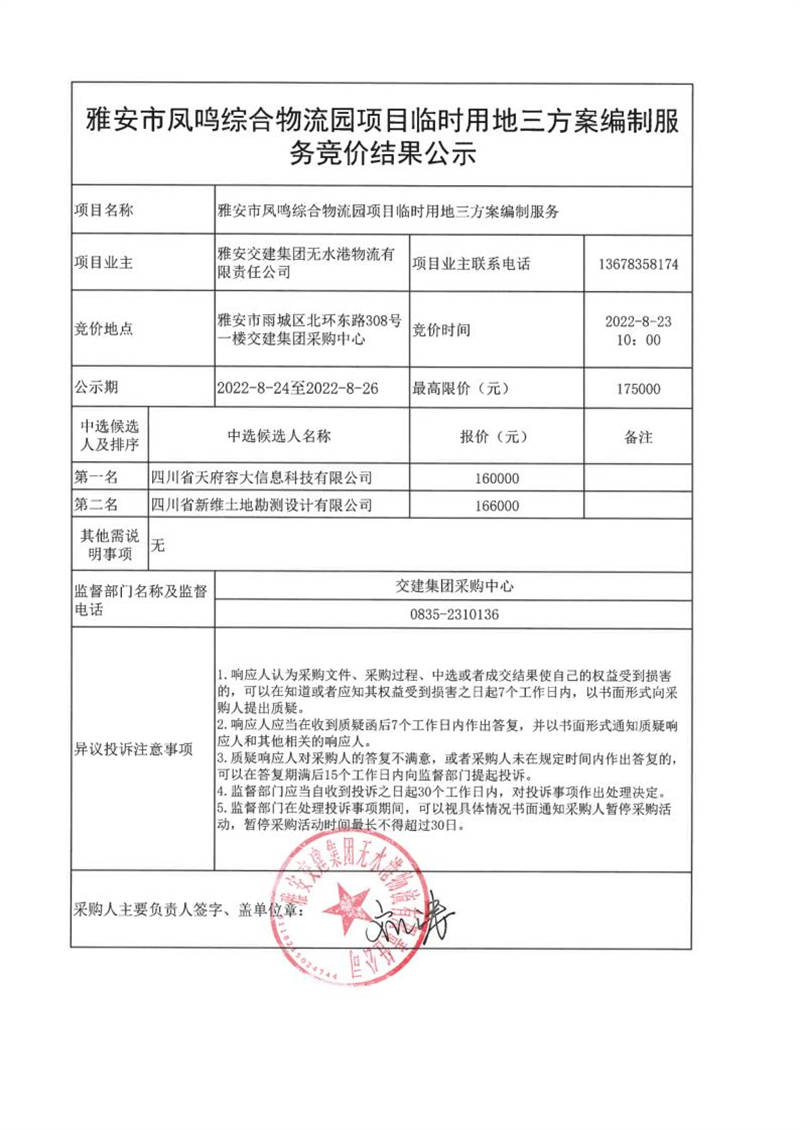 雅安交建集團(tuán)無水港物流有限責(zé)任公司雅安市鳳鳴綜合物流園項(xiàng)目臨時(shí)用地三方案編制服務(wù)競價(jià)結(jié)果公示