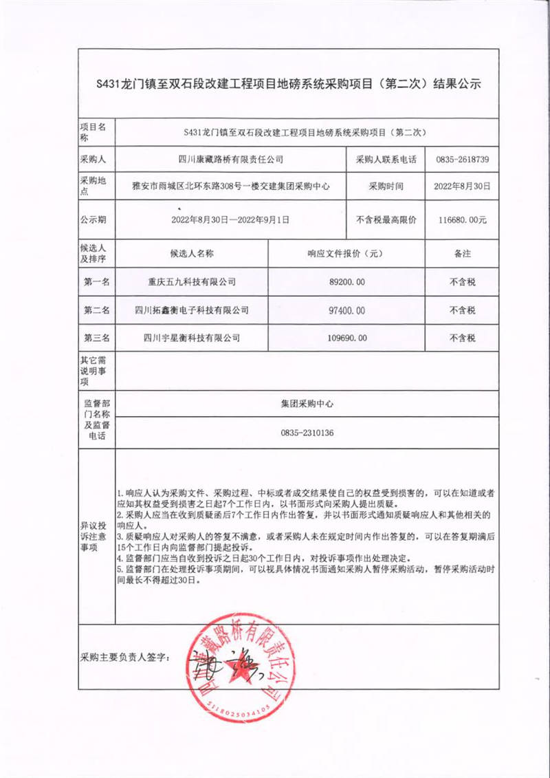 四川康藏路橋有限責(zé)任公司S431龍門鎮(zhèn)至雙石段改建工程項目地磅系統(tǒng)采購項目(第二次)結(jié)果公示