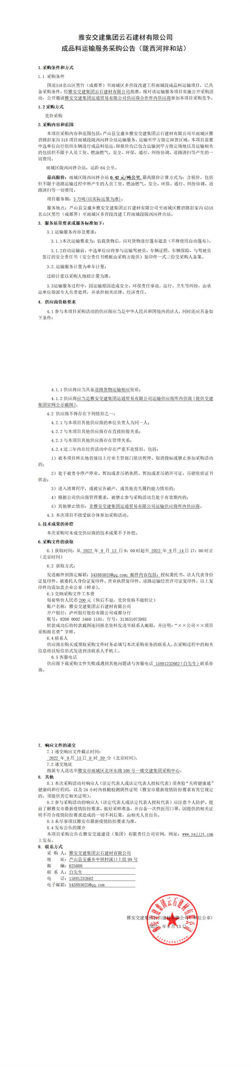 雅安交建集團云石建材有限公司成品料運輸服務(wù)采購公告(皇茶大道拌和站)