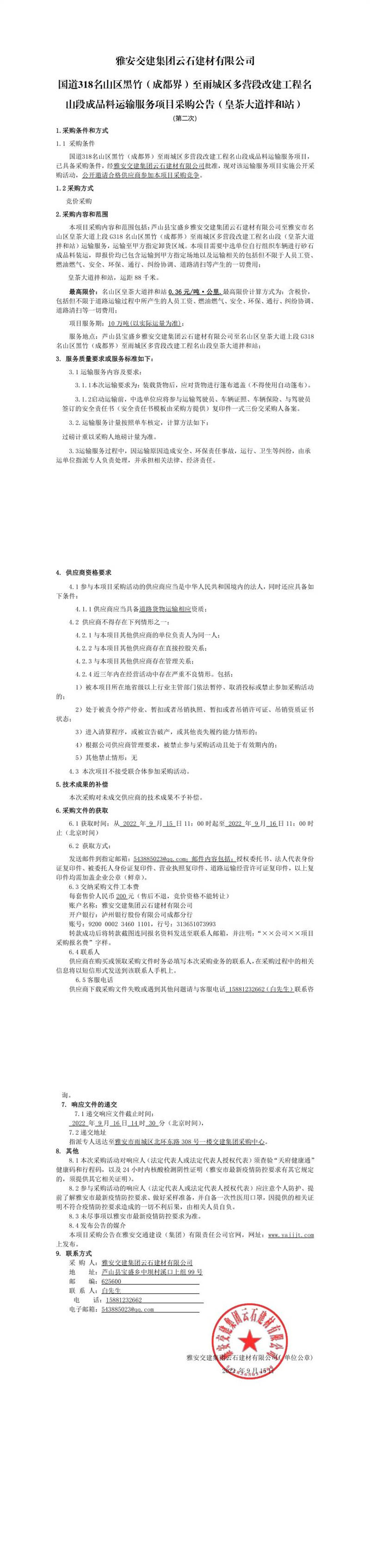 雅安交建集團云石建材有限公司國道318名山區(qū)黑竹(成都界)至雨城區(qū)多營段改建工程名山段成品料運輸服務(wù)項目采購公告(皇茶大道拌和站)