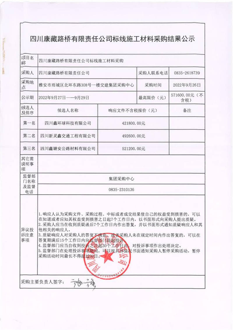 四川康藏路橋有限責(zé)任公司標(biāo)線(xiàn)施工材料采購(gòu)結(jié)果公示