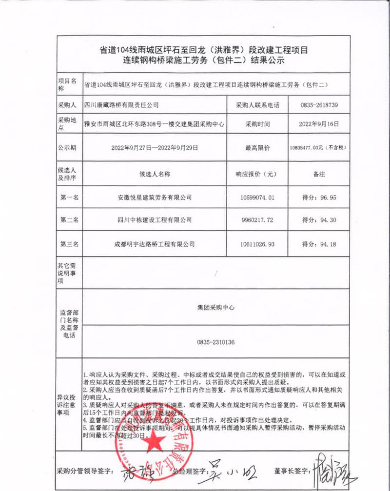 四川康藏路橋有限責任公司省道104線雨城區(qū)坪石至回龍(洪雅界)段改建工程項目連續(xù)鋼構(gòu)橋梁施工勞務(wù)(包件二)結(jié)果公示